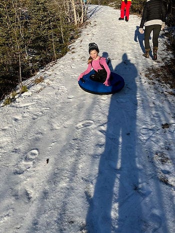 (Winter holidays at the lake wouldn't be complete without sledding!)