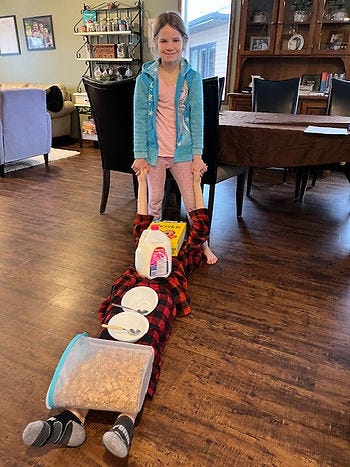 (so apparently this was an easier way to get breakfast to the table; the brother as a food tray. And I promise those PJs were washed in between all the events)